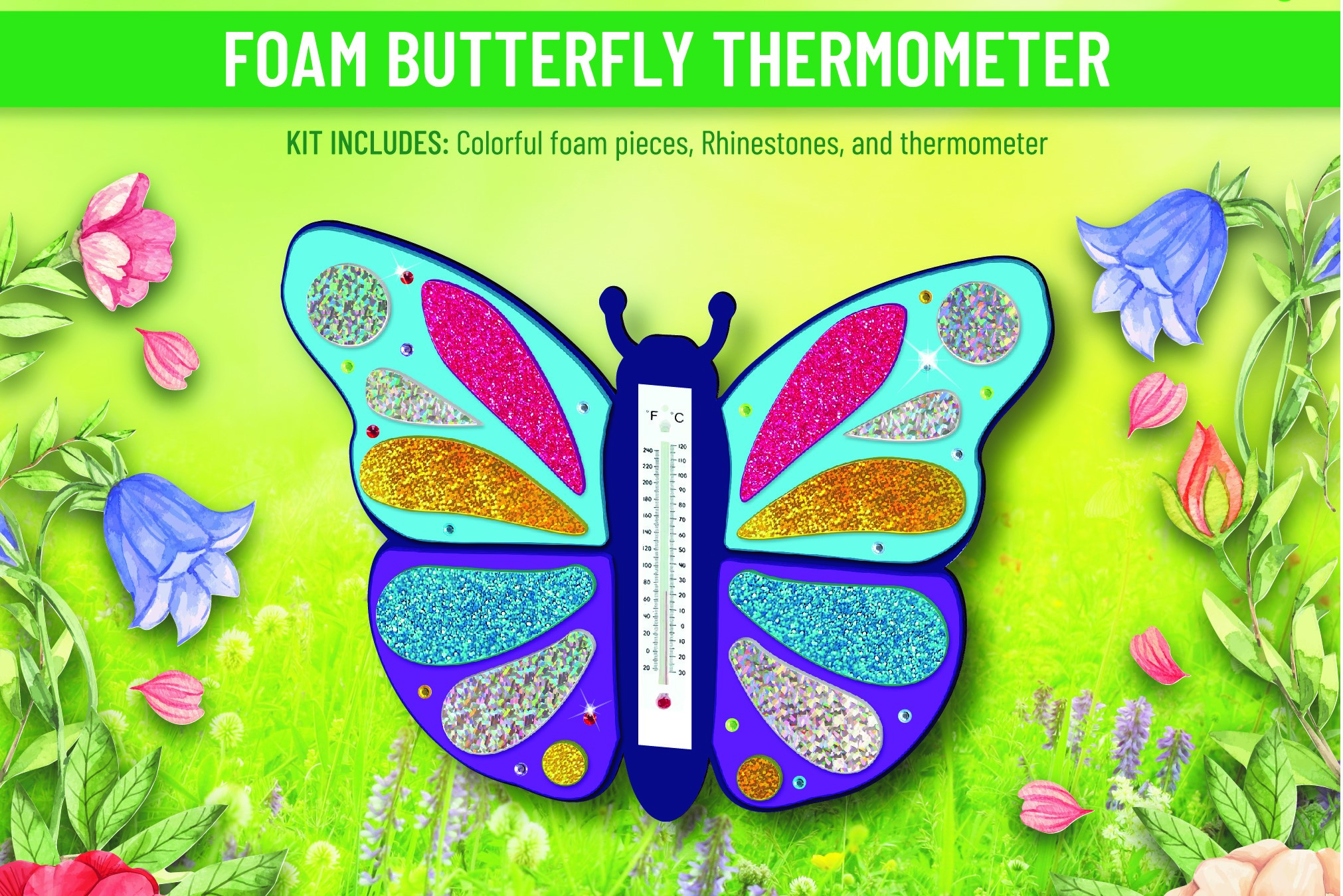Glitter foam pieces, edhesive rhinestones, thermometer and hang tab