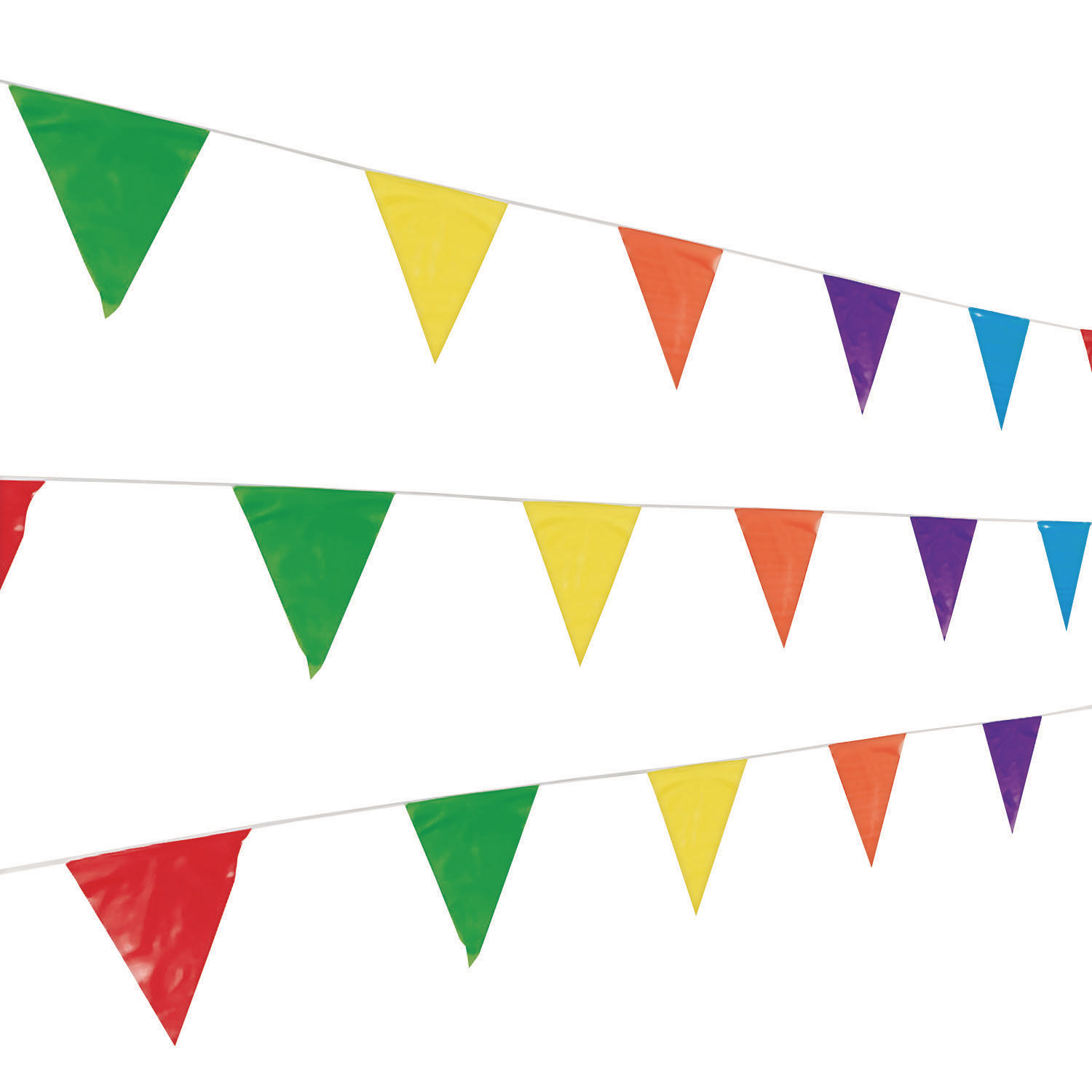 This colorful, plastic pennant banner can serve as a decoration, area divider, or queue marker. Use at school events, camps or sports games. Suitable for indoor and outdoor use.