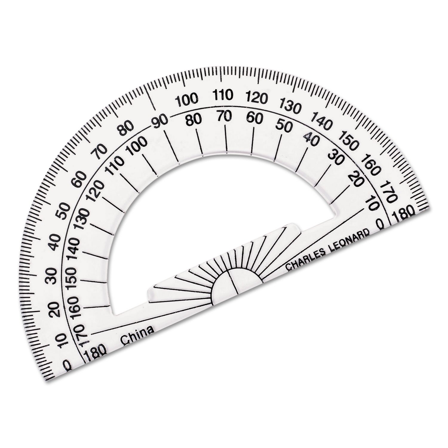 6″ protractors with a range of 180 degrees. Tinted with 1/2 degree graduations and open in the center.