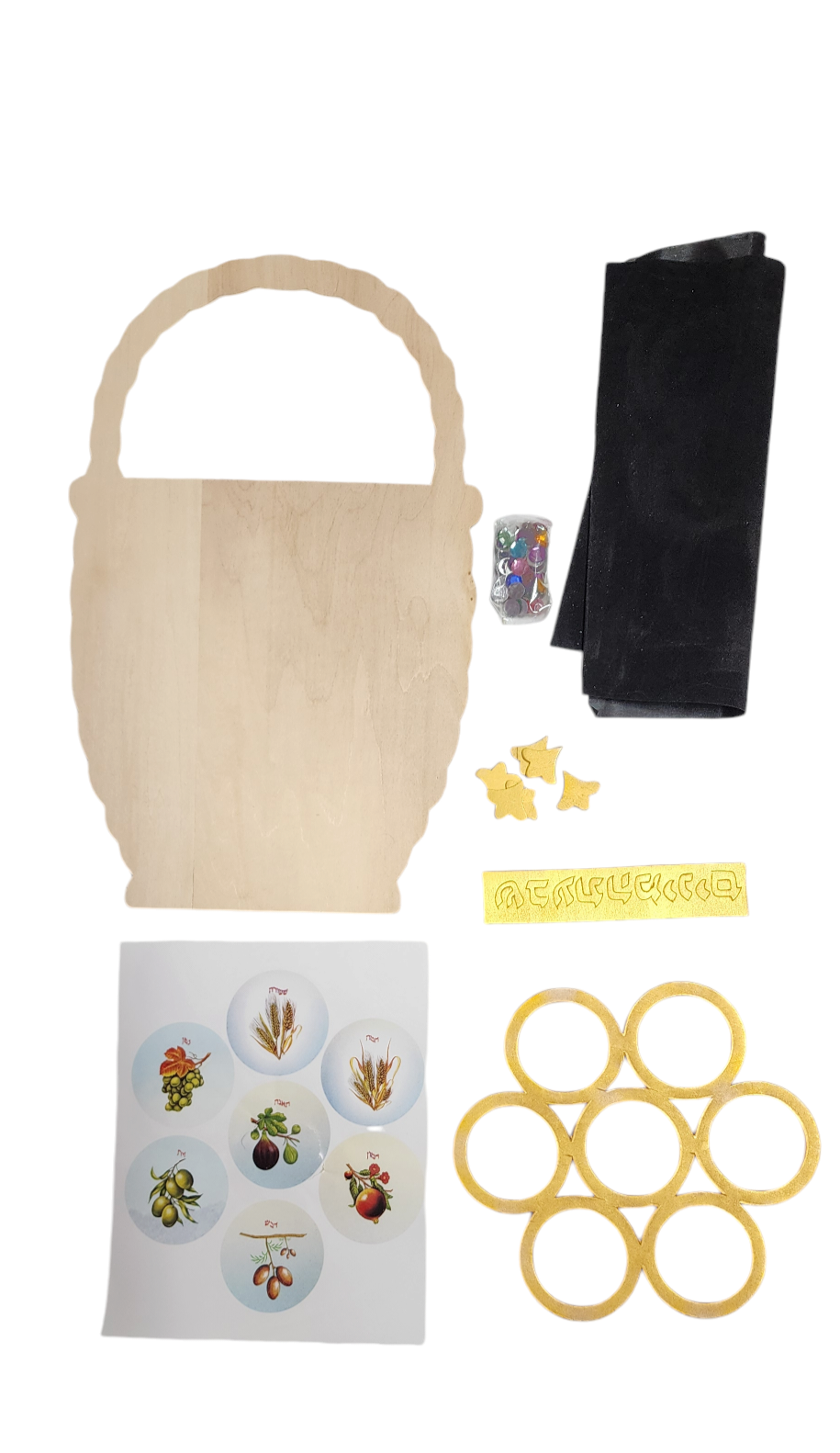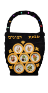Basket-shaped and backed with velvet, this magnificent Shivas Haminim display will ehance your Sukkah decorations. Shivas Haminim plaque includes: High quality pre-sanded and pre-painted wood, wooden pieces, velvet, hook, rhinestones, pictures. Measures 9 X 15″.”